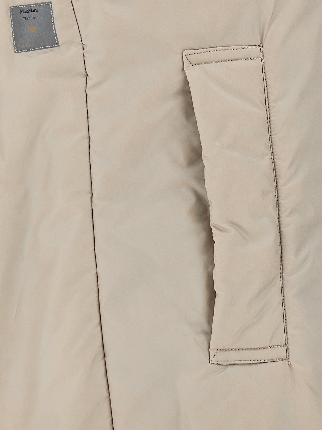 'Greengo' waistcoat in slightly padded Cameluxe waterproof canvas, adjustable hood, top zip closure, pockets, drawstring at the hem.