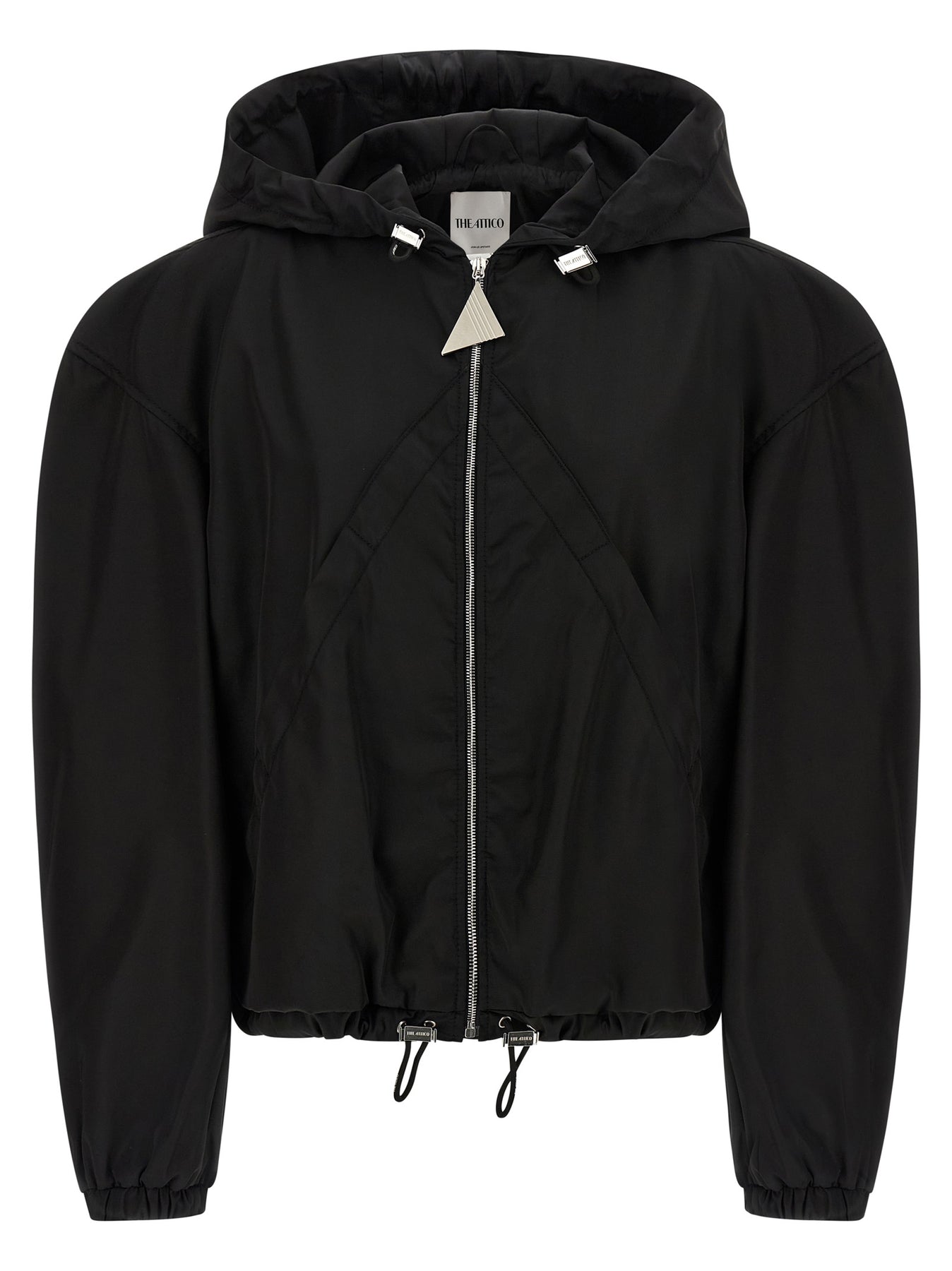 Nylon bomber jacket, maxi adjustable hood, front zip closure with metal logo zipper, pockets, wide curved sleeves with elastic cuffs and dropped shoulder, drawstring on the hem.