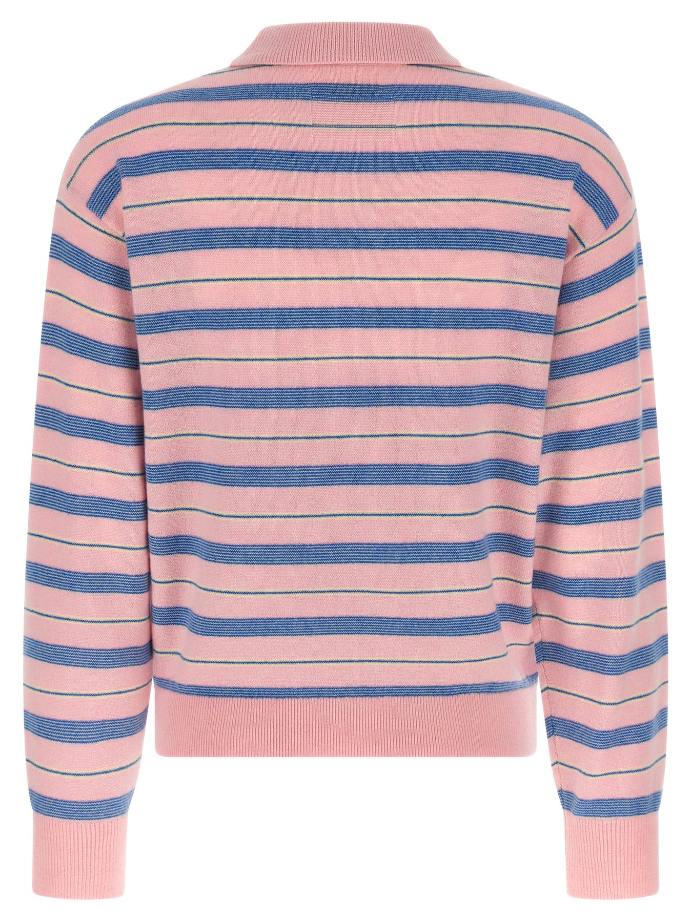 'Collegiate Stripe' polo style sweater with collar and front closure, 3 buttons, striped pattern, long sleeves with cuffs.