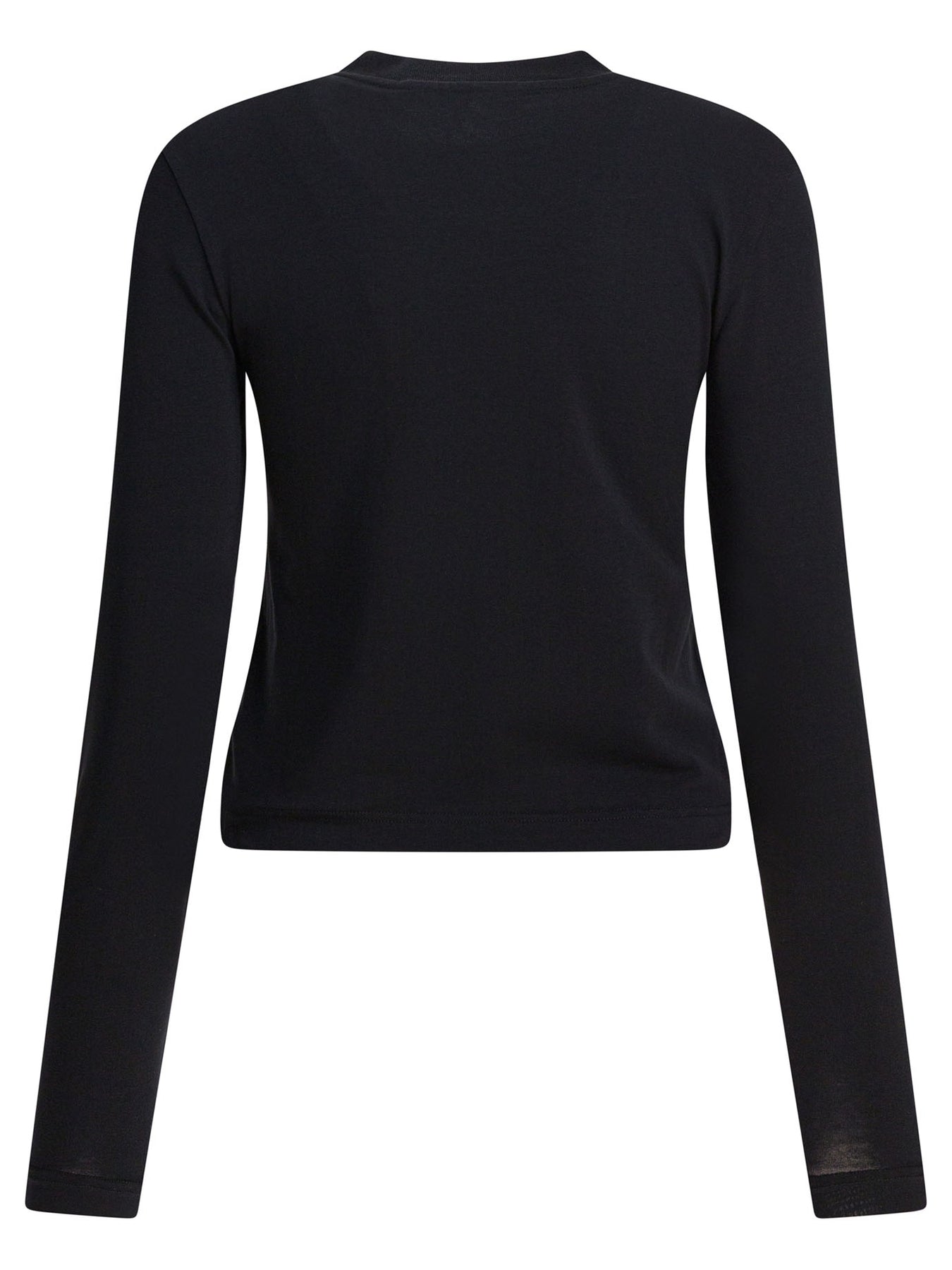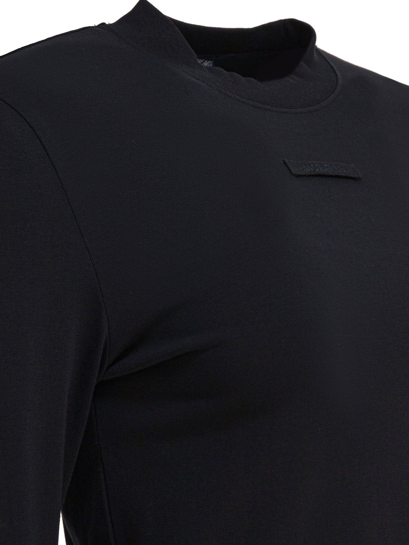 Jacquemus "Gros Grain" long-sleeved T-shirt with fitted construction in stretch cotton. The main fabric, composed mainly of cotton with a percentage of elastane, gives elasticity and a compact structure. The essential silhouette features long sleeves and a ribbed crew neck. An embroidered grosgrain logo is applied to the chest, visible as a textural detail on the front surface. The finish features sharp edging and regular stitching. || - Gros-grain logo embroidered on the chest - Long sleeves - Stretch cotton - Ribbed crew neck - Cropped fit