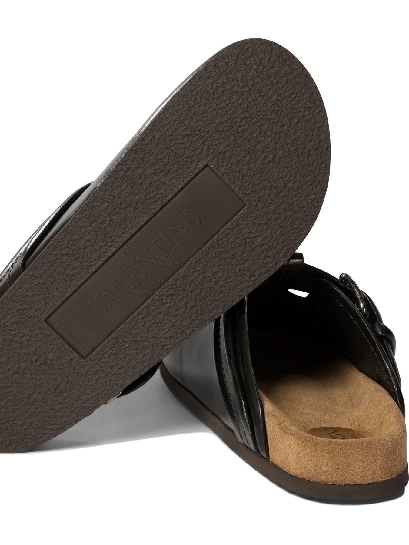 Valentino Garavani's Fussfriend sabots represent the ideal of masculine elegance combined with comfort and functionality. Made of fine calf leather, these sabots are a perfect choice for the modern man who appreciates style without sacrificing everyday comfort. || - Signature VLogo detailing ruthenium-colored finish - Adjustable buckle strap - Anatomically shaped inner fussbet lined in suede - Rubber sole || Perfect for pairing with a casual chic look, these sabots pair wonderfully with a pair of chino pants, a neutral linen shirt, or a sport jacket for an effortless touch of sophistication.