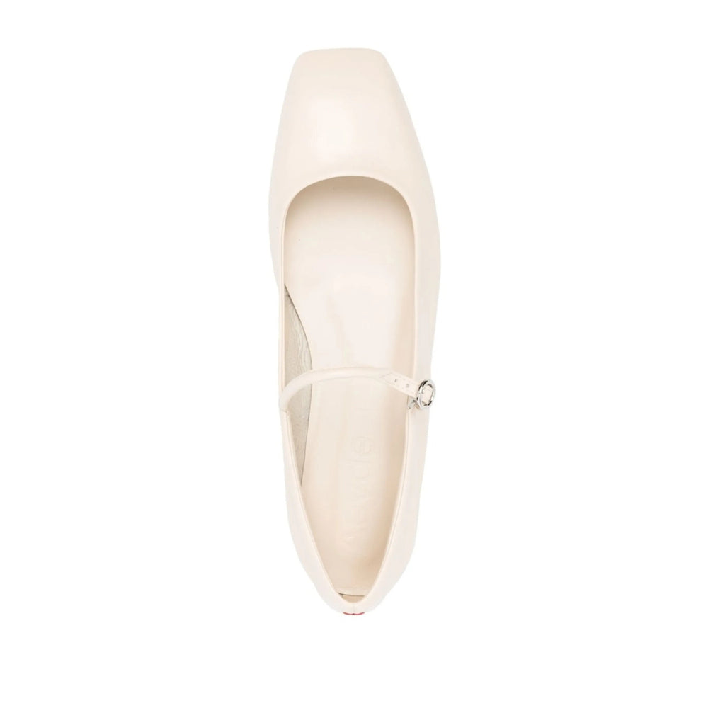 cream white calf leather front buckle fastening square toe branded leather insole buckle-fastening ankle strap square toe flat leather sole