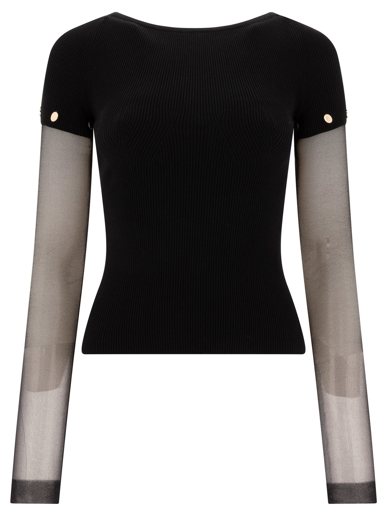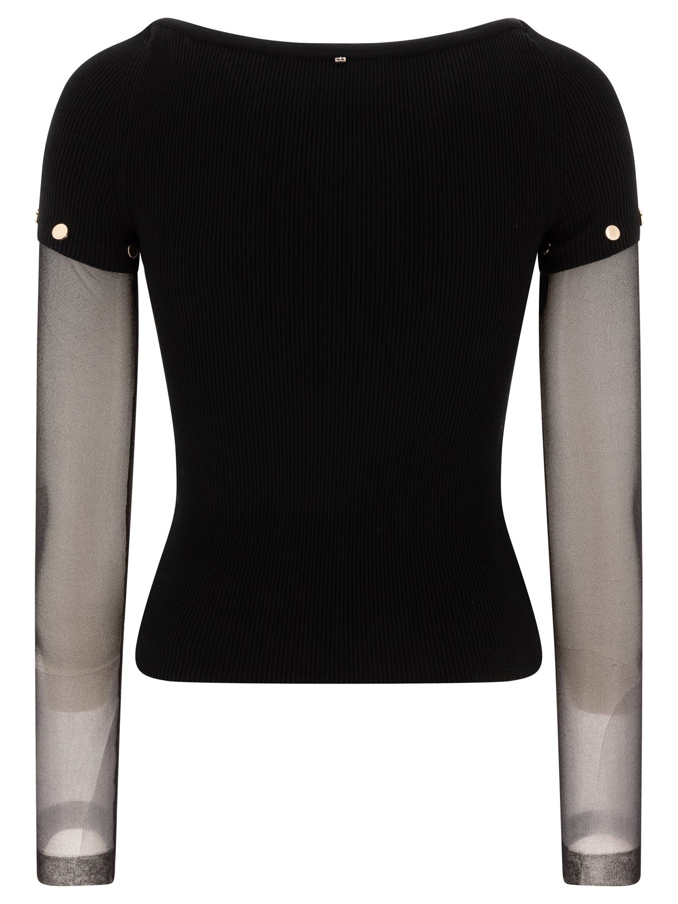 Max Mara Sportmax crew-neck T-shirt in medium-weight stretch viscose, featuring a regular line and fitted structure. The garment features a boat neckline and removable long sleeves, made of transparent viscose, secured by custom buttons. Front stockings draw the bust line. The construction combines a compact knit and functional details designed for modularity and versatility of use. || - Solid color - Removable long sleeves made of transparent viscose - Custom sleeve buttons - Bateau neckline - Embossed front piping - Medium-weight stretch fabric - Regular fit