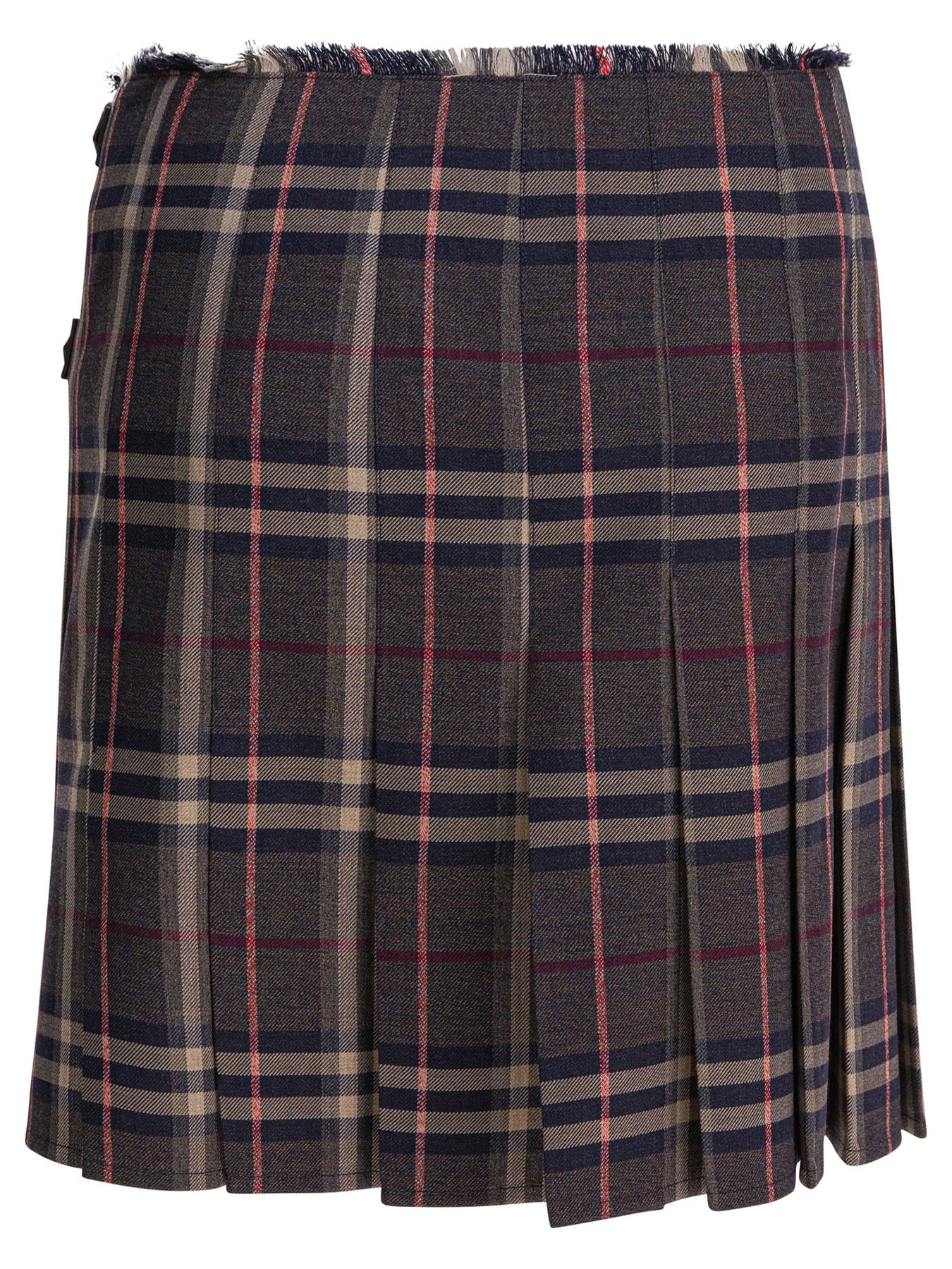 Burberry's wool "Check" mini kilt represents the perfect balance between tradition and modernity, expressing understated and versatile elegance. This iconic garment is distinguished by its flared silhouette, enhanced by classic pleats that recall the brand's historic textile workmanship. Designed for a woman who appreciates refined details, the kilt offers snug comfort thanks to high-quality materials, perfect for a variety of occasions, from everyday outings to more formal events. || - Check - Kilt - Mid-rise waist - Regular fit - Made of wool woven with Burberry Check - Side button closure with B-shaped buckle - Short, thin bangs at waist - Burberry lettering engraved on the buckles - Environmentally sustainable product