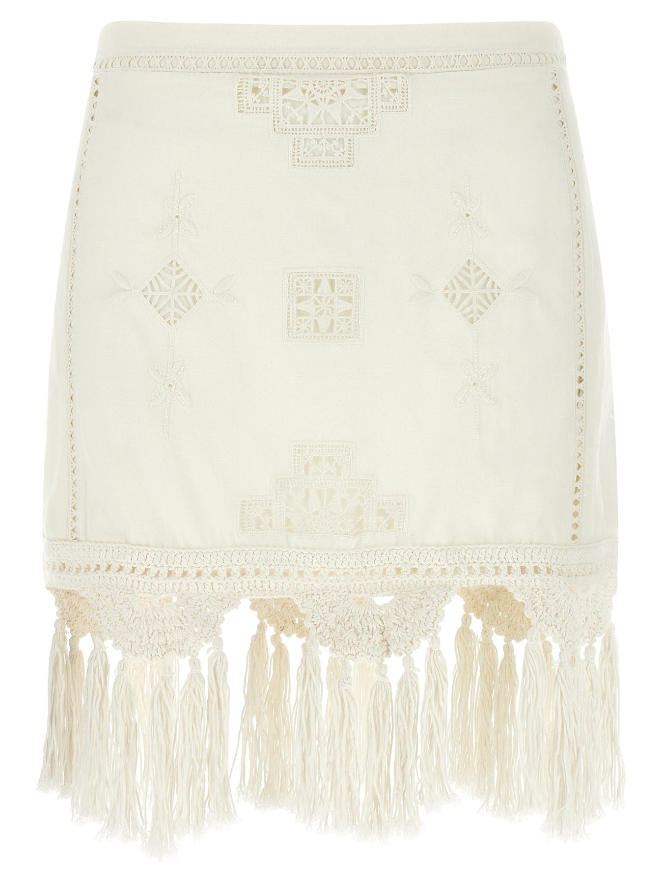 Mini 'Sandra' cotton skirt with sangallo details and macramé hem with tassels, back zip closure, lining.