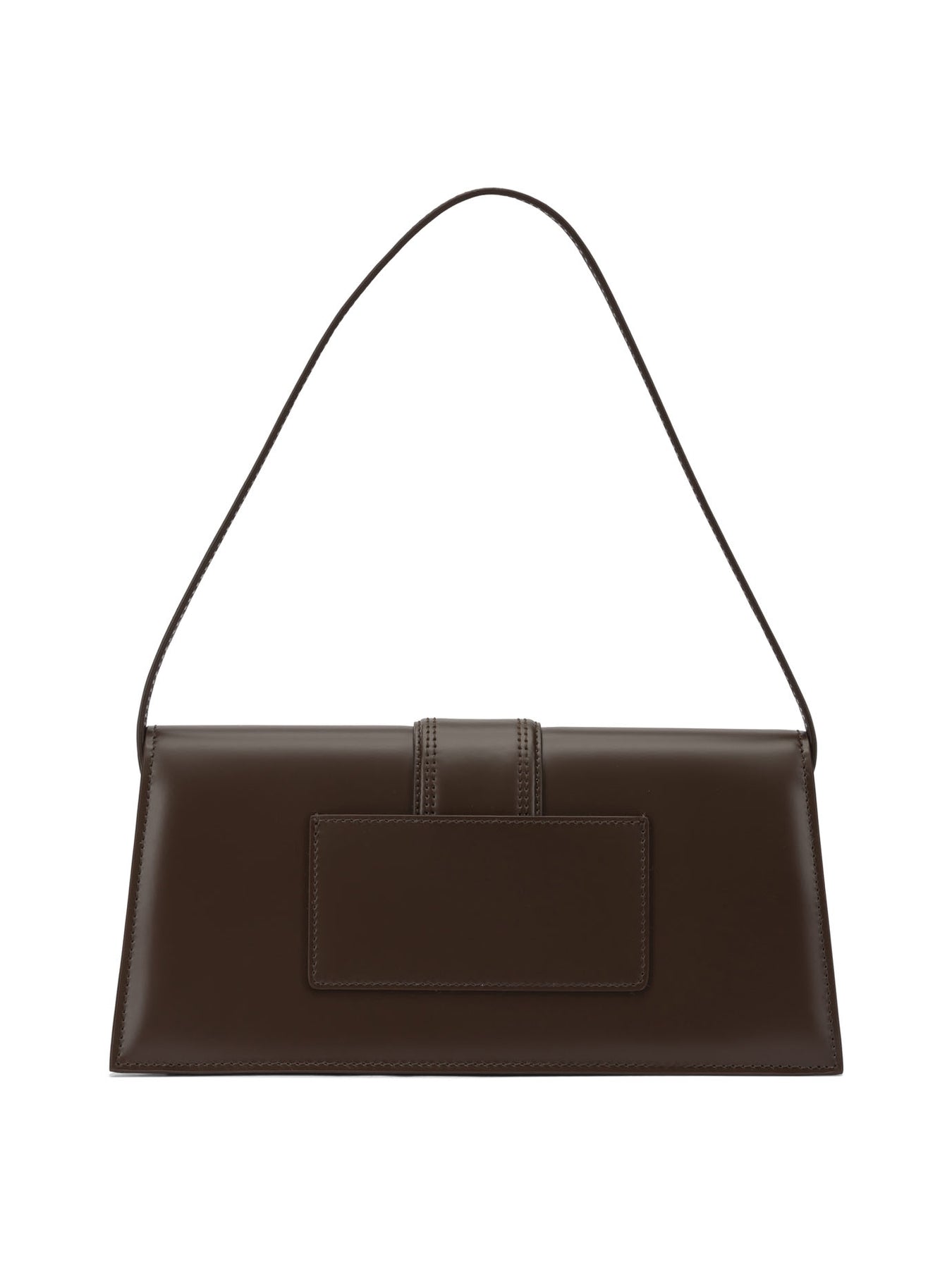 Jacquemus "Le Bambino Long" shoulder bag made of rigidly structured leather with an elongated silhouette and minimal construction. The design features a front flap with magnetic closure, a thin applied shoulder strap, gold metal details and contrasting dyed edges. The interior, fully lined in cotton, is organized with a dedicated credit card pocket. An external pocket, integrated into the surface, is attached to the back. || - Textured leather construction - Interior fully lined in cotton - Front flap with magnetic closure - Slim shoulder strap - Back patch pocket - Interior card pocket - Gold metal trim and logo - Edges finished with dye