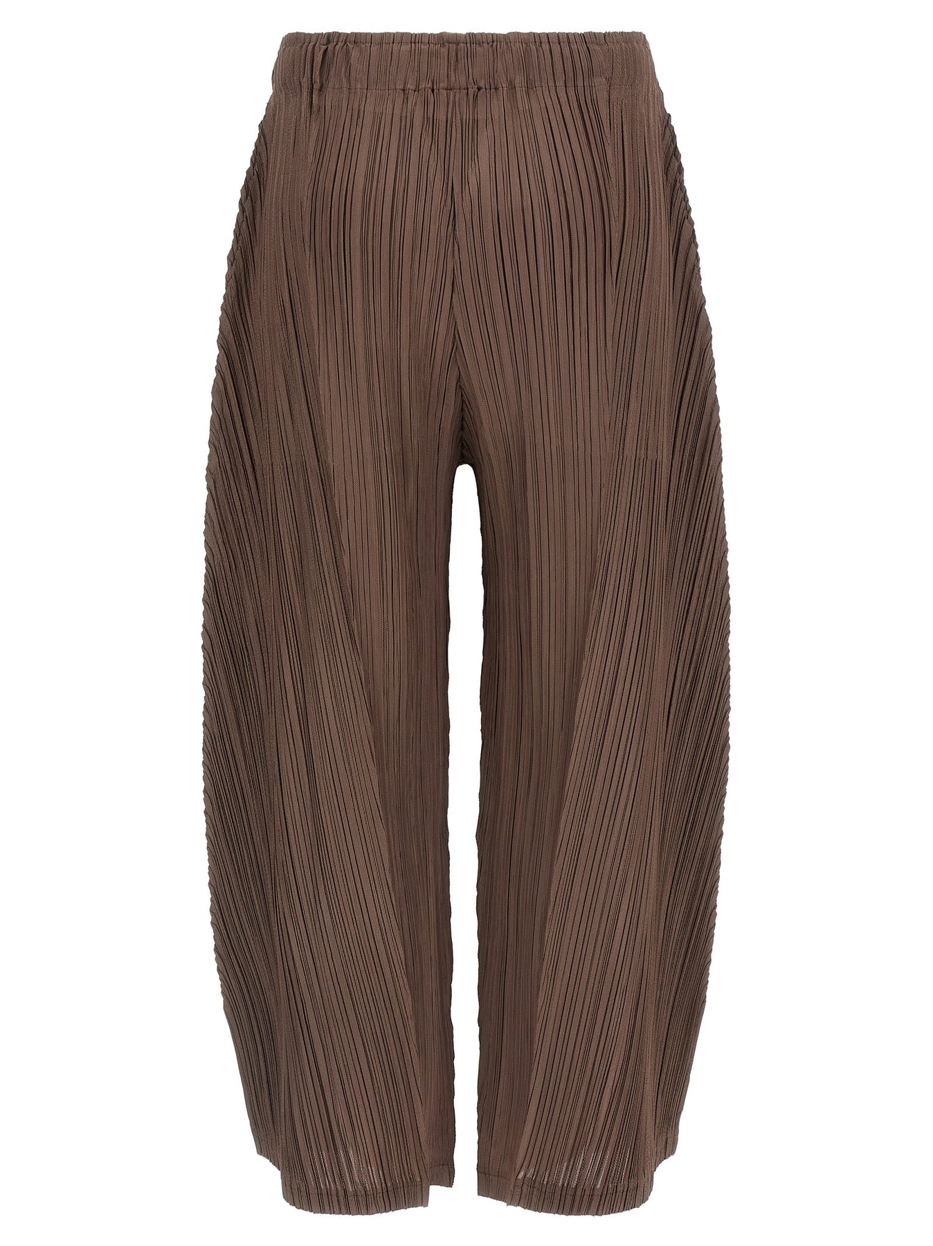 'Thicker Bottoms 2' pleated fabric trousers, barrel silhouette, elastic waistband, pockets, split on the leg bottom, characterized by central pleats and a partial diagonal pleating created by folding the garment before subjecting it to the pleating process.