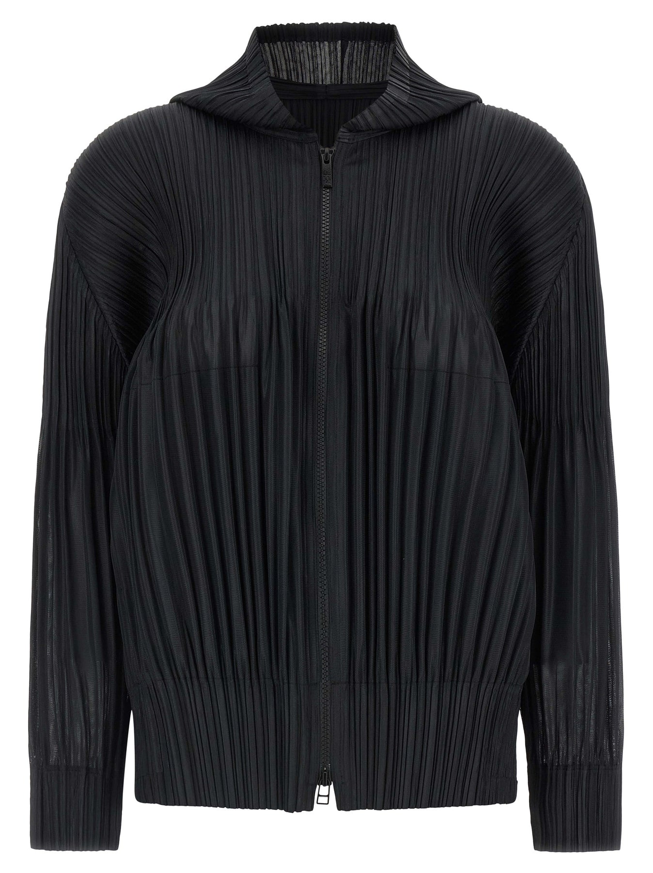 Pleated hooded blouse in front zip closure, front pockets, and long cuffed sleeves.