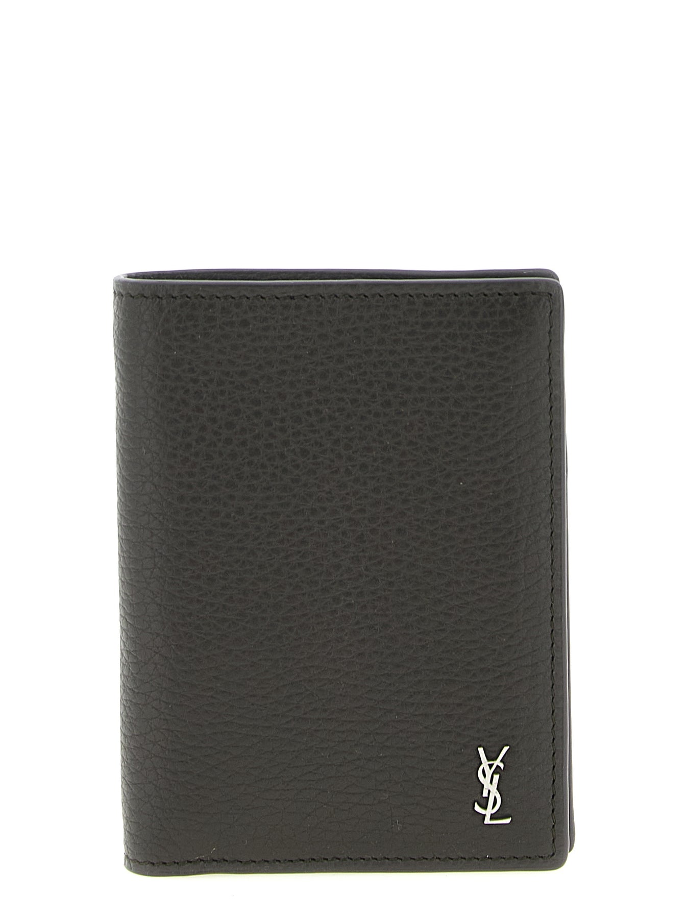 Hammered leather card holder, front metal 'Tiny Cassandre' logo, book opening.