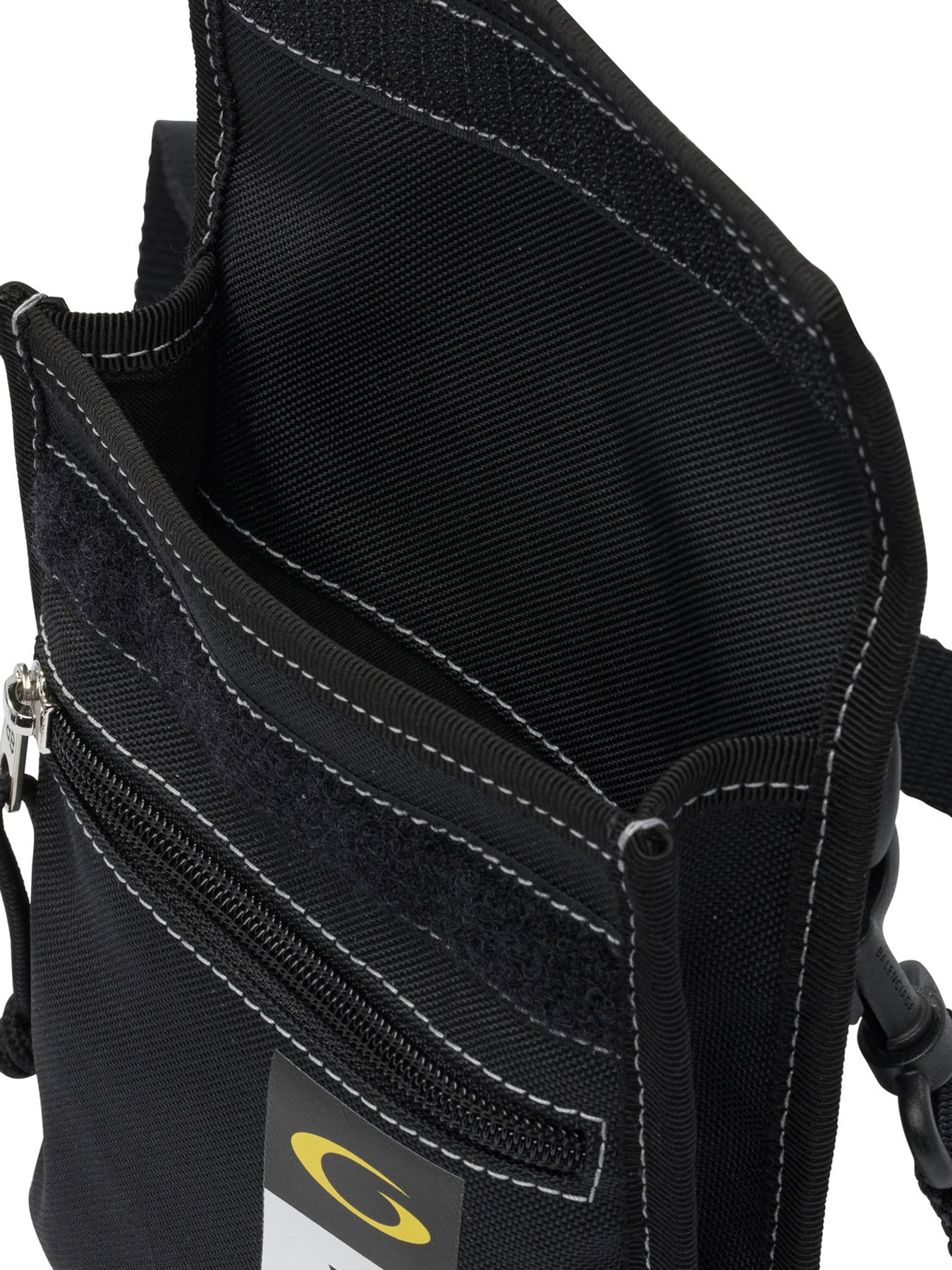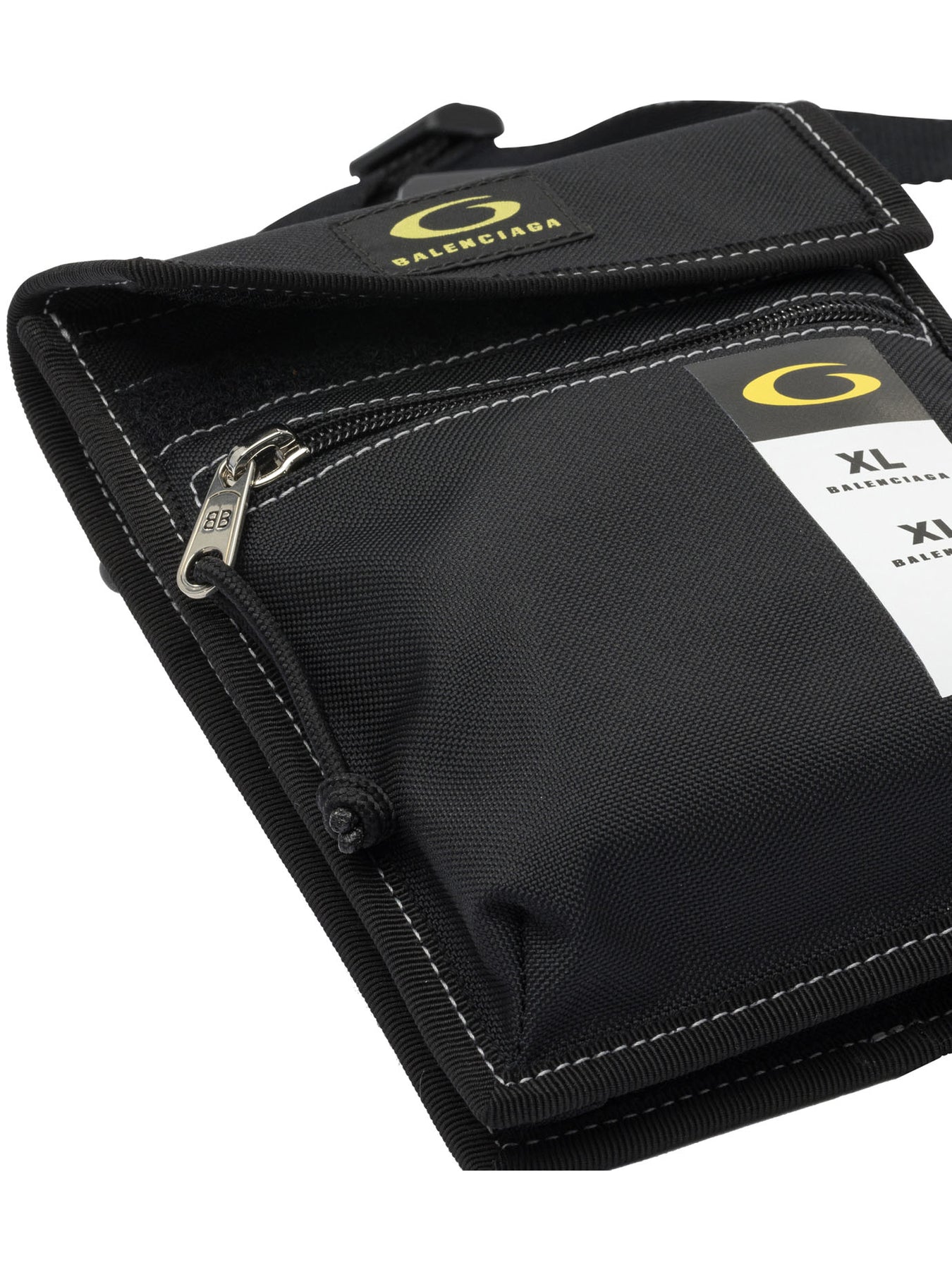 Balenciaga "Explorer" crossbody bag with a compact silhouette and semi rigid structure. Made of recycled nylon, it features an adjustable and removable shoulder strap for different modes of use. The construction integrates a zippered main compartment, a front zippered pocket and a patch pocket on the back. Functional elements include engraved logo zipper puller and cotton drawstring, polyamide and polyester work tag, finish with cotton canvas inner lining. || - Recycled nylon to support structure - Adjustable and removable shoulder strap - Balenciaga logo on front - Main compartment with zipper closure - Front pocket with zipper - Back patch pocket - Zipper puller with engraved BB logo and cotton drawstring