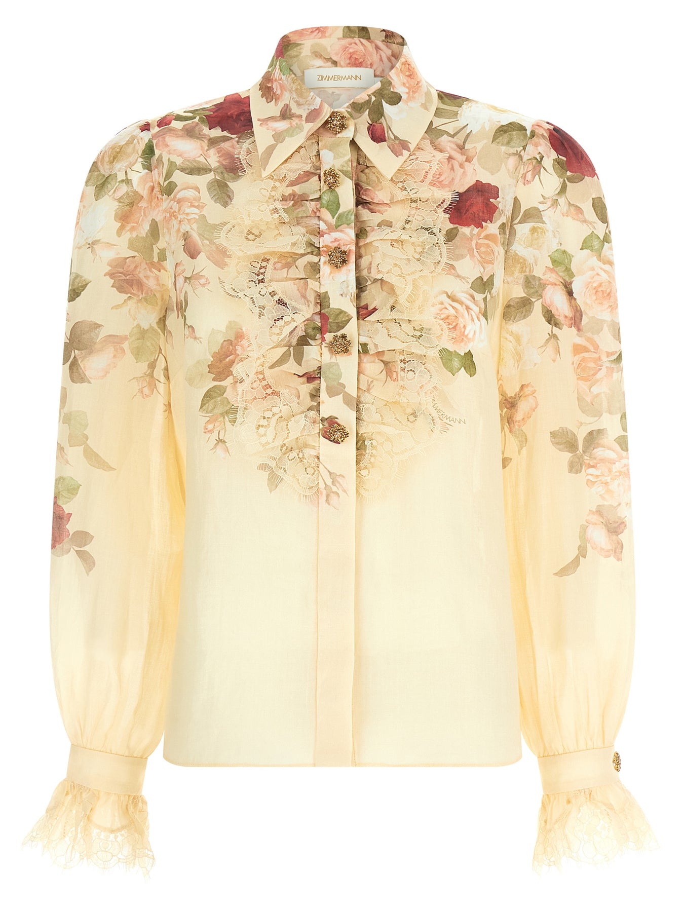 'Hypnotic Tux' floral patterned ramie shirt, front jewel button closure with lace ruffles, long sleeves with lace flounced cuffs.