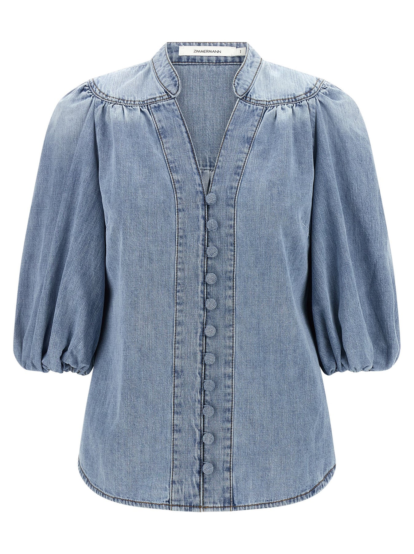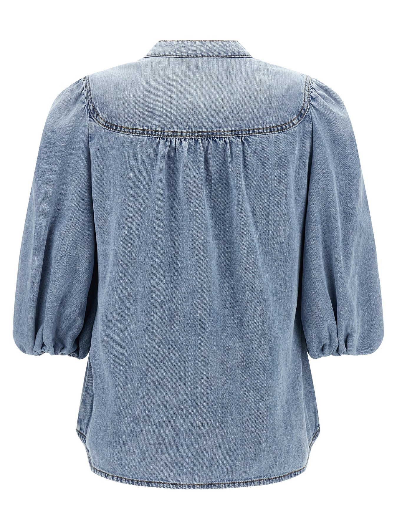 'Lucky' cotton denim blouse with V-neck with Korean collar, front button closure, ruffled shoulders, 3/4 balloon sleeves.