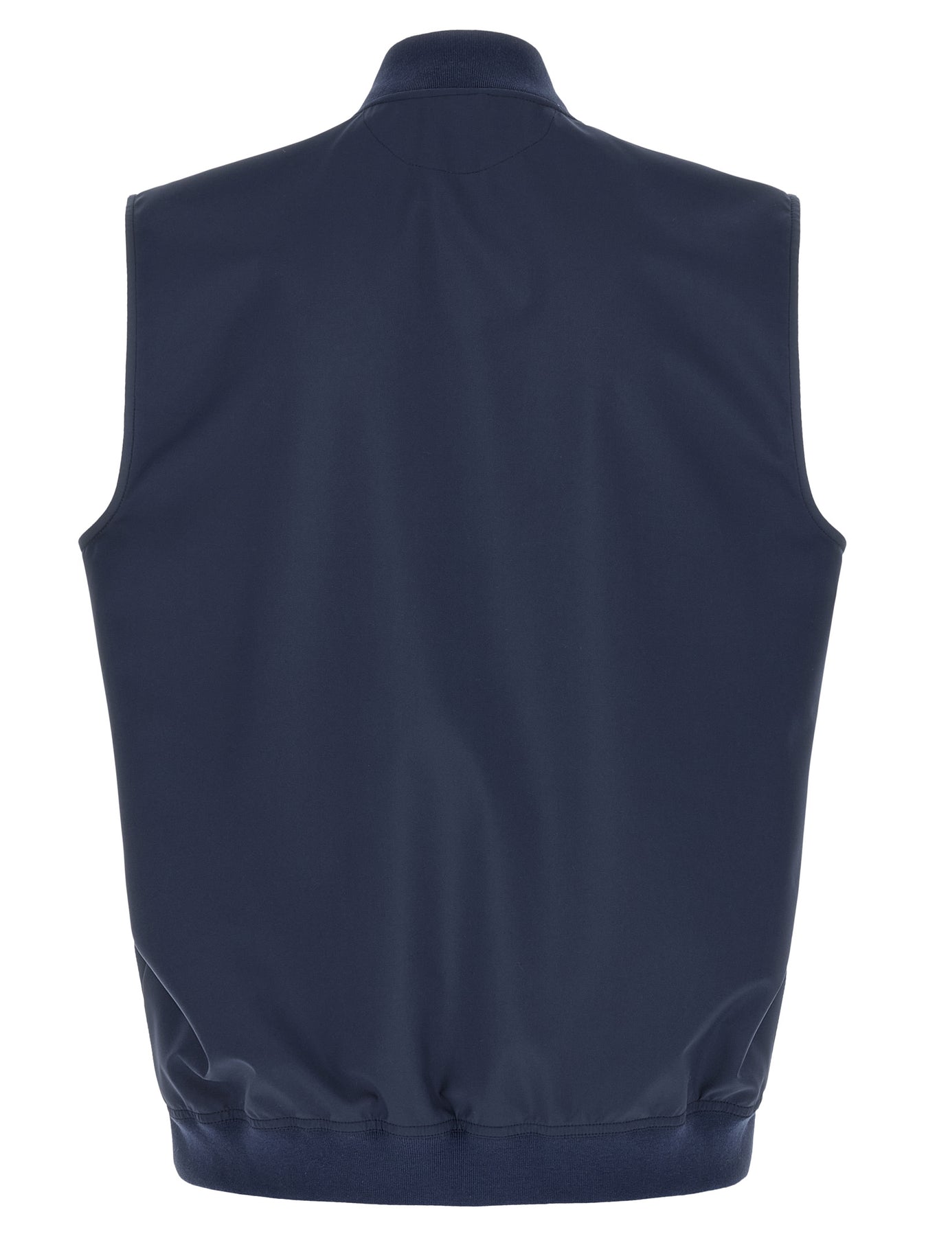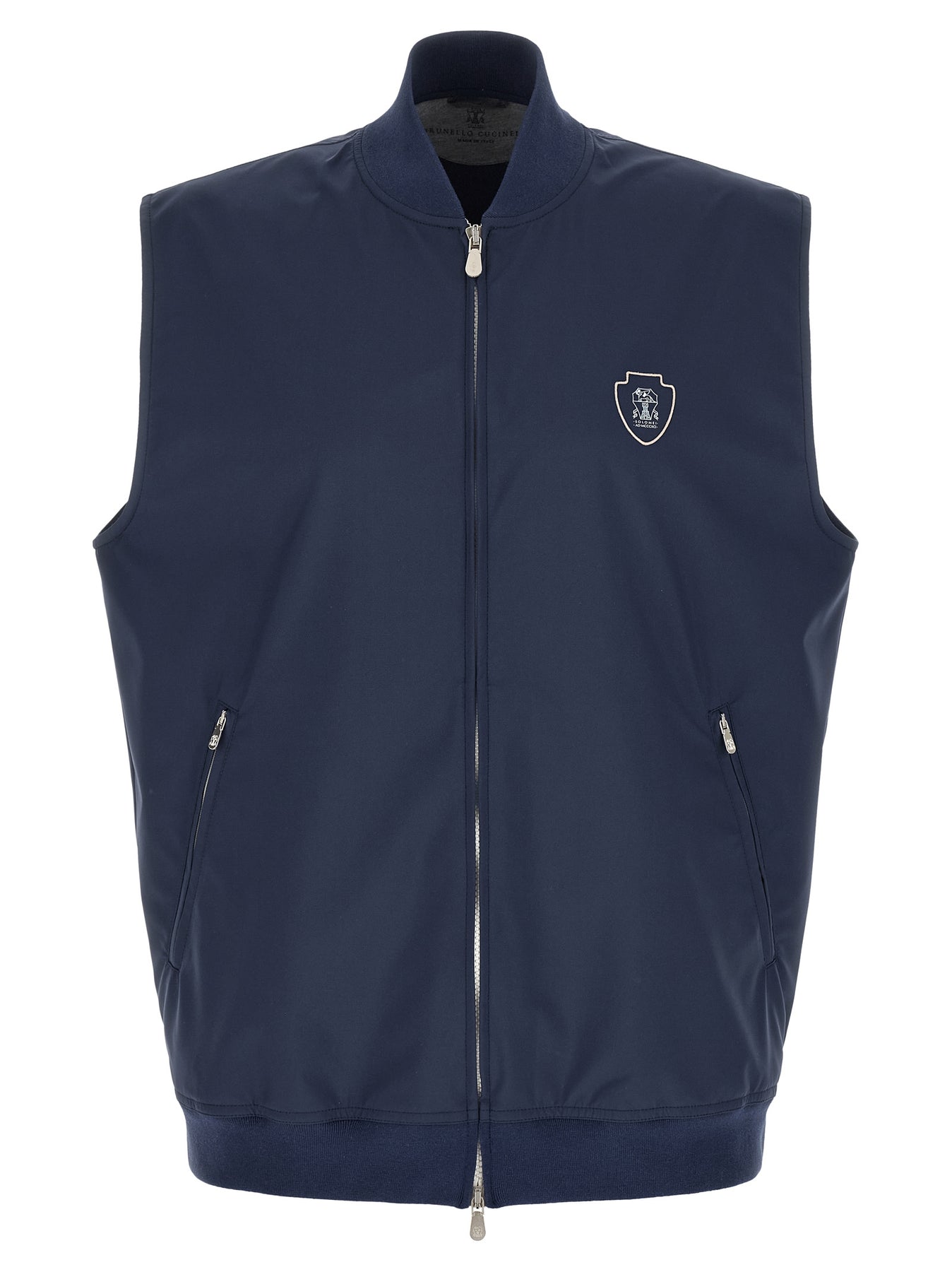 Breathable and water-repellent nylon vest with tone-on-tone ribbed knit details, unlined, logo embroidery and front zip closure, high neck, pockets, headband.