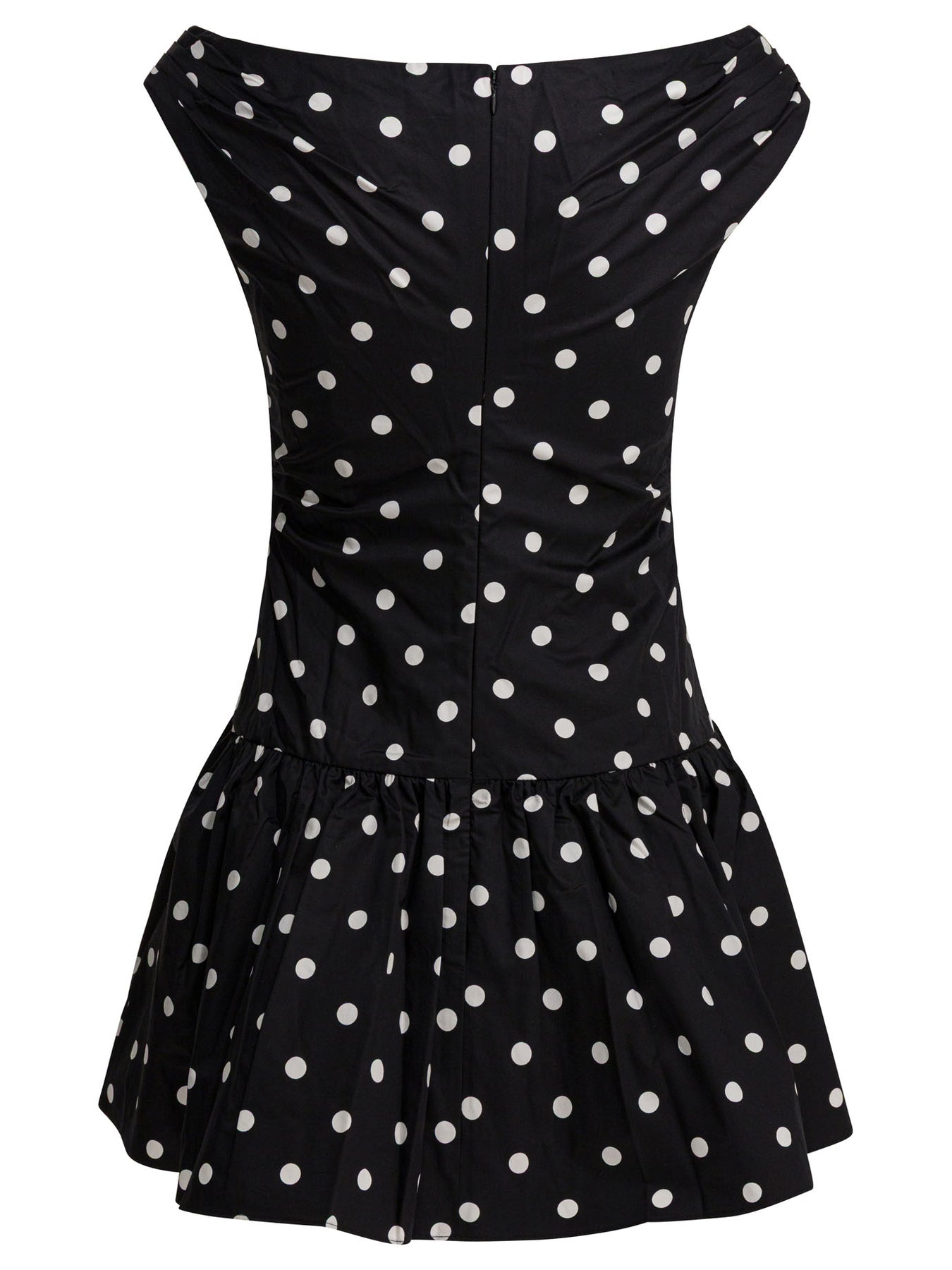 Self-portrait polka-dot flared dress features a off-shoulder construction and fitted silhouette at the top. Features ruffles at the waist that define the structure and create a transition to a flared skirt. The closure is with a concealed back zipper. The fabric offers minimal stretch and a regular fit. Ruffled detail at the waist emphasizes the low line. || - Polka dots - Flared dress - Sleeveless - Fitted silhouette at the top - Low waist - Gathered detail at the waist - Flared skirt - Concealed back zipper closure - Minimal fabric elongation - Regular fit