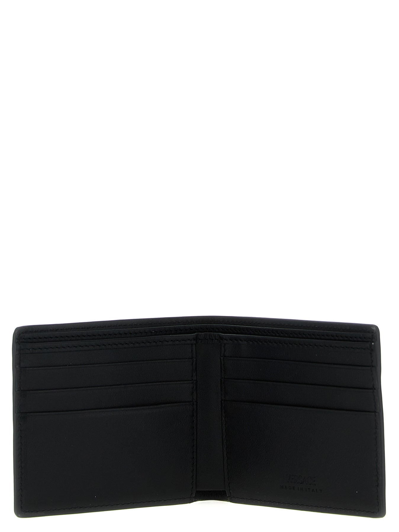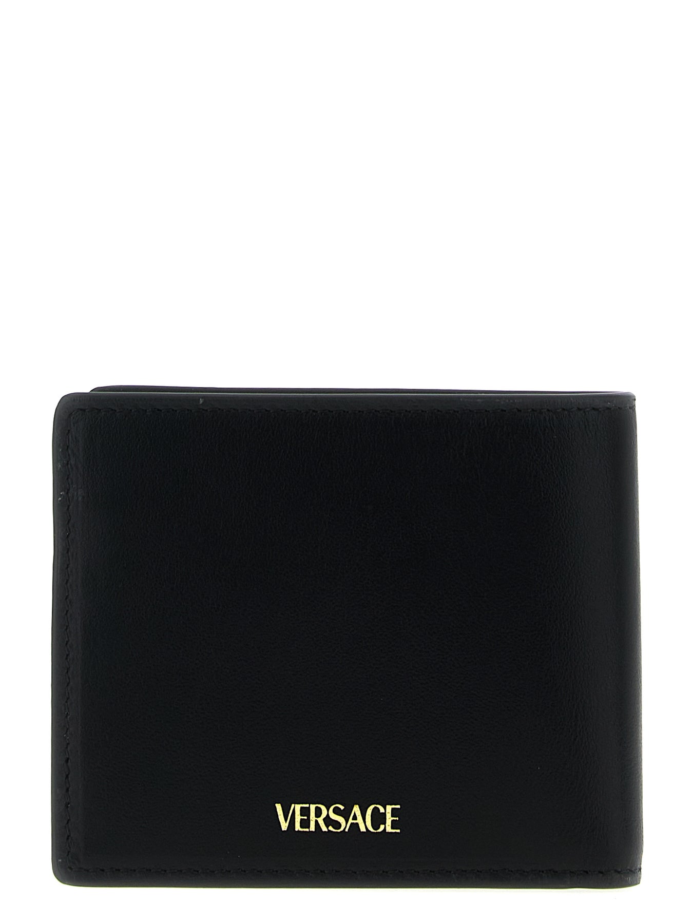 Bi-fold leather wallet with metal 'V Logo' on the front, book opening, and embossed logo on the back.