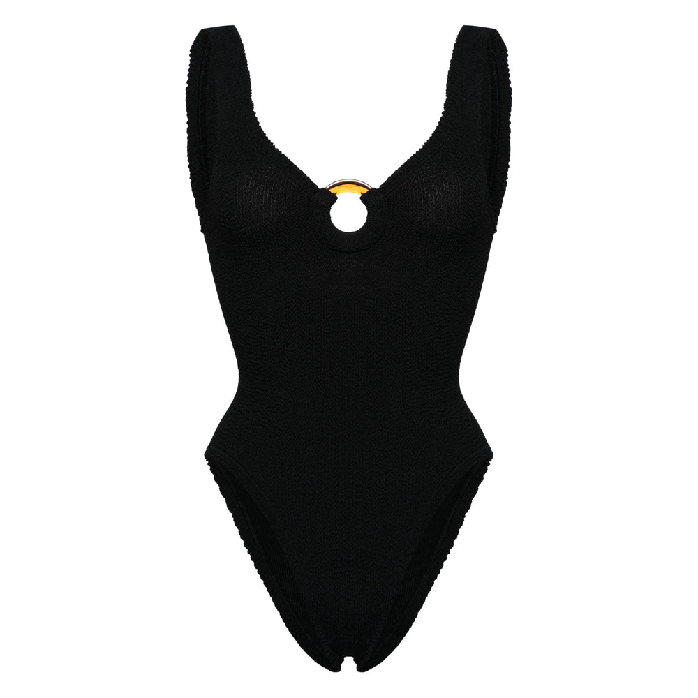 black stretch design V-neck scoop back unlined pull-on style Original Crinkle™ fabrication tortoiseshell-effect hoop detailing Be mindful to try on swimwear over your own garments.
