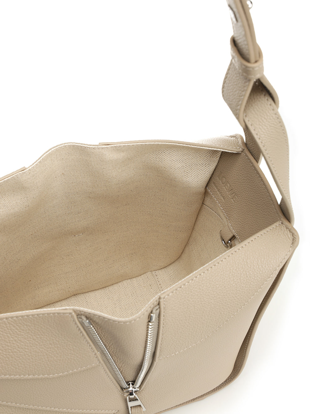 Compact "Hammock" bag in grained calfskin from Loewe, with adjustable and removable shoulder strap, internal hook fastening, one external zip pocket, two internal open pockets, herringbone cotton canvas lining and embossed Anagram pattern