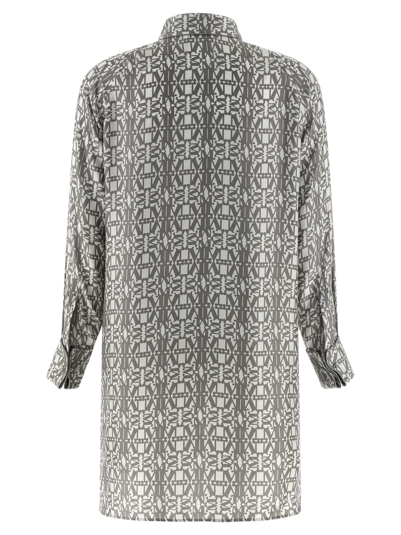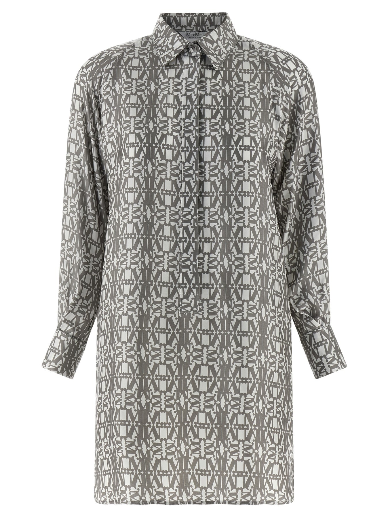 'Grembo' mini dress in pure silk twill with all-over Monogram print, chemisier model, front button closure, long sleeves with cufflinks, side slits, asymmetrical hem, unlined.