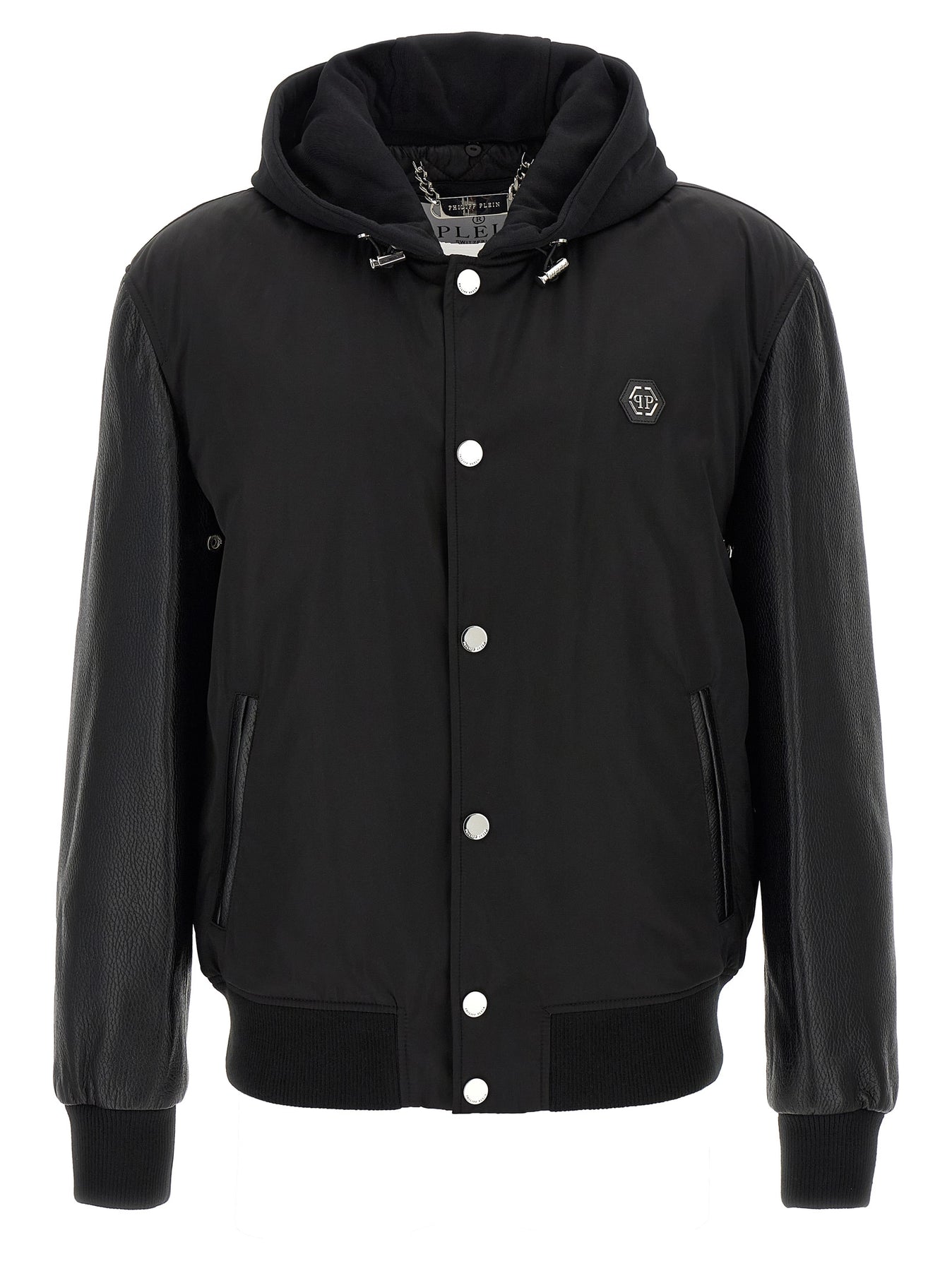 Varsity' nylon fabric bomber jacket with ribbed stretch knit details, quilted and padded lining, adjustable and removable hood, Saffiano leather patch with metal logo and front snap button closure, pockets, long sleeves in deer-print leather with cuffs.