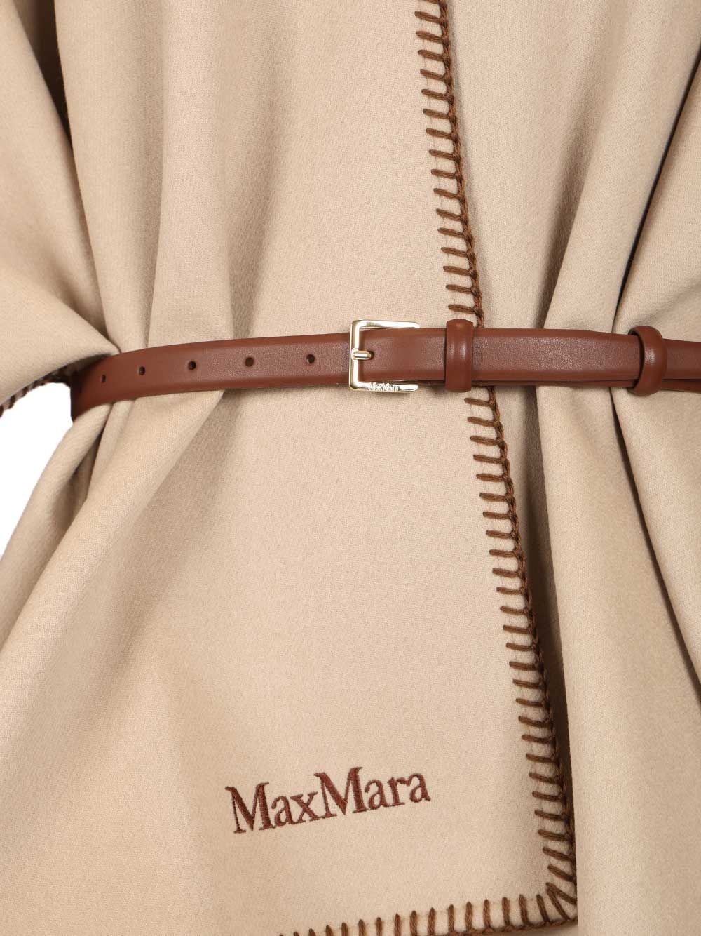 Wool and cashmere cape by Max Mara, finished with saddle stitching and matching belt, Max Mara lettering logo embroidered on the bottom