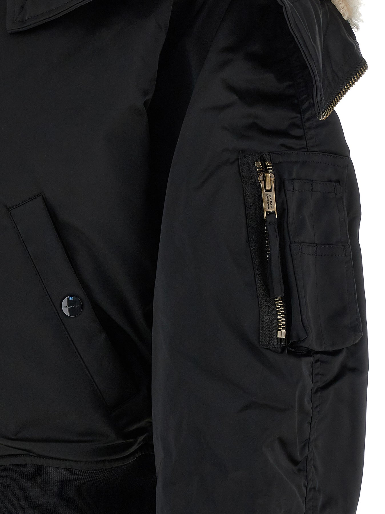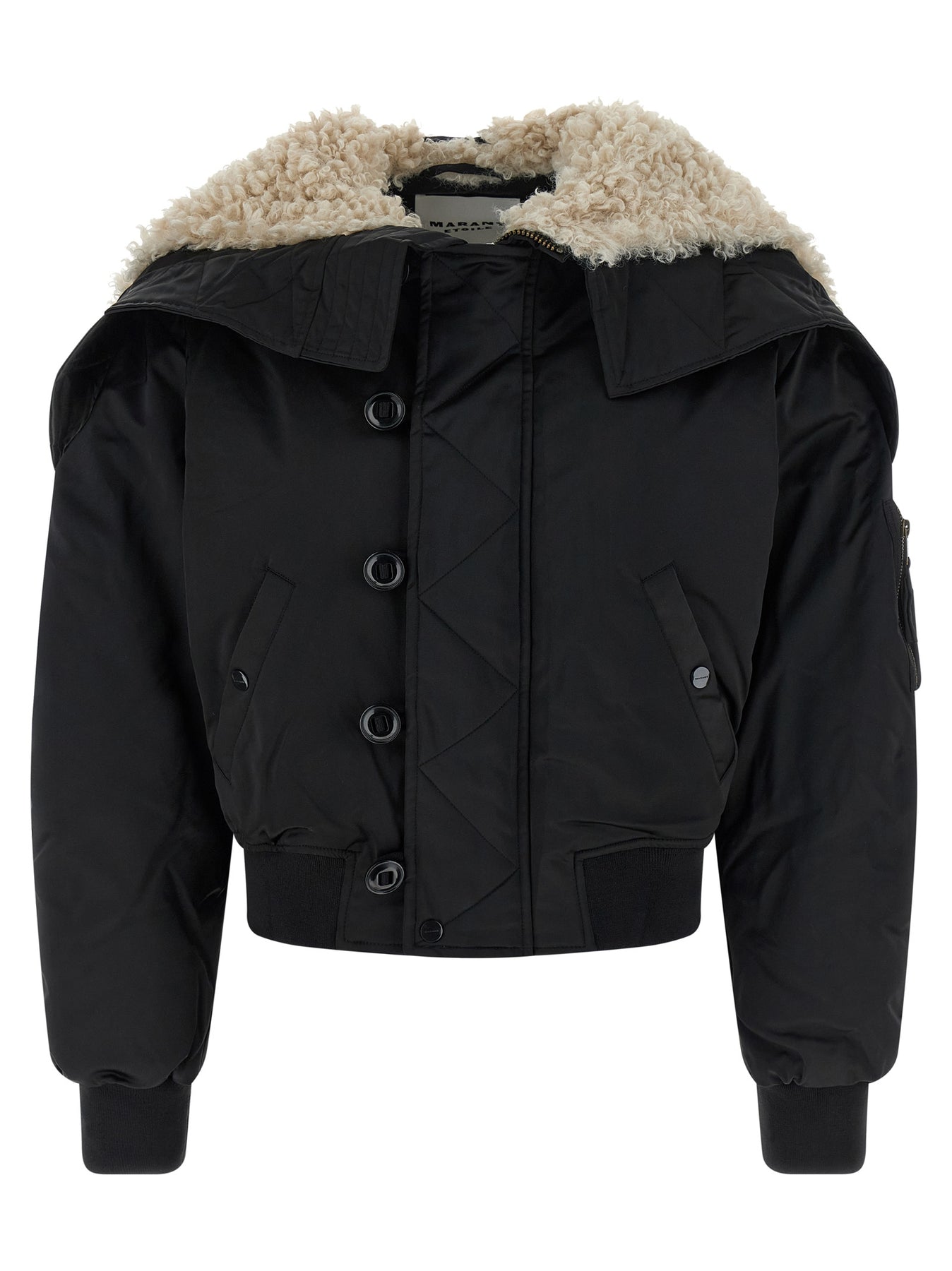 'Elisa' slightly padded satin bomber jacket with tone-on-tone stretch knit details, hood with zip and shearling-effect fabric lining, high neck, front zip and button closure, pockets, long sleeves with elastic cuffs.