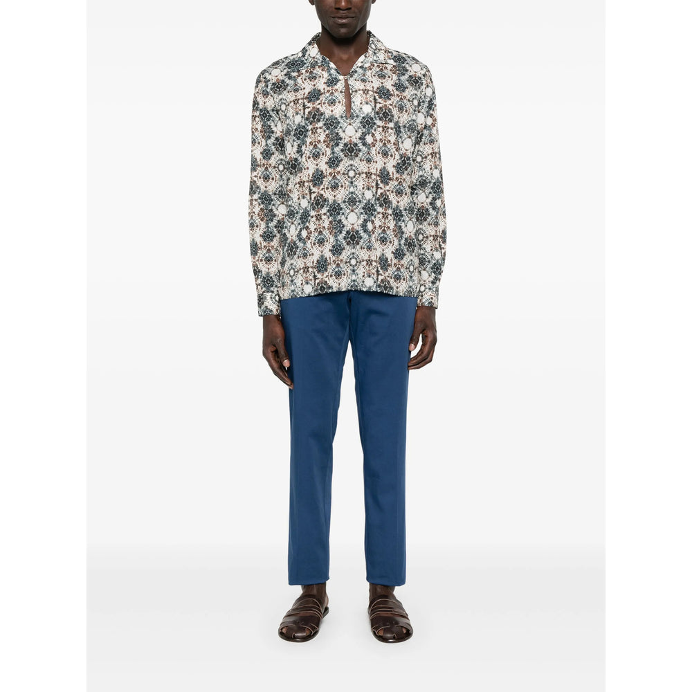 sapphire blue concealed fly and button fastening belt loops two diagonal pockets to the sides two rear welt pockets