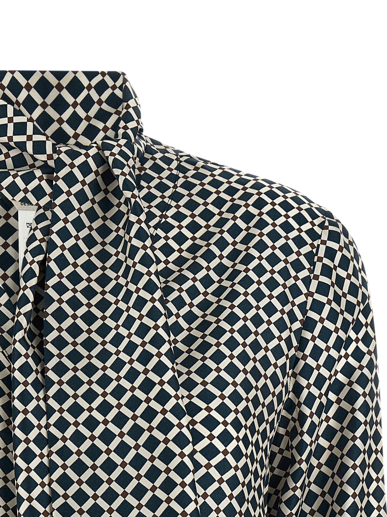 SmmVittoria shirt in pure patterned silk twill, V-neck, matching sash with removable scarf effect, concealed front button closure, long cuffed sleeves.