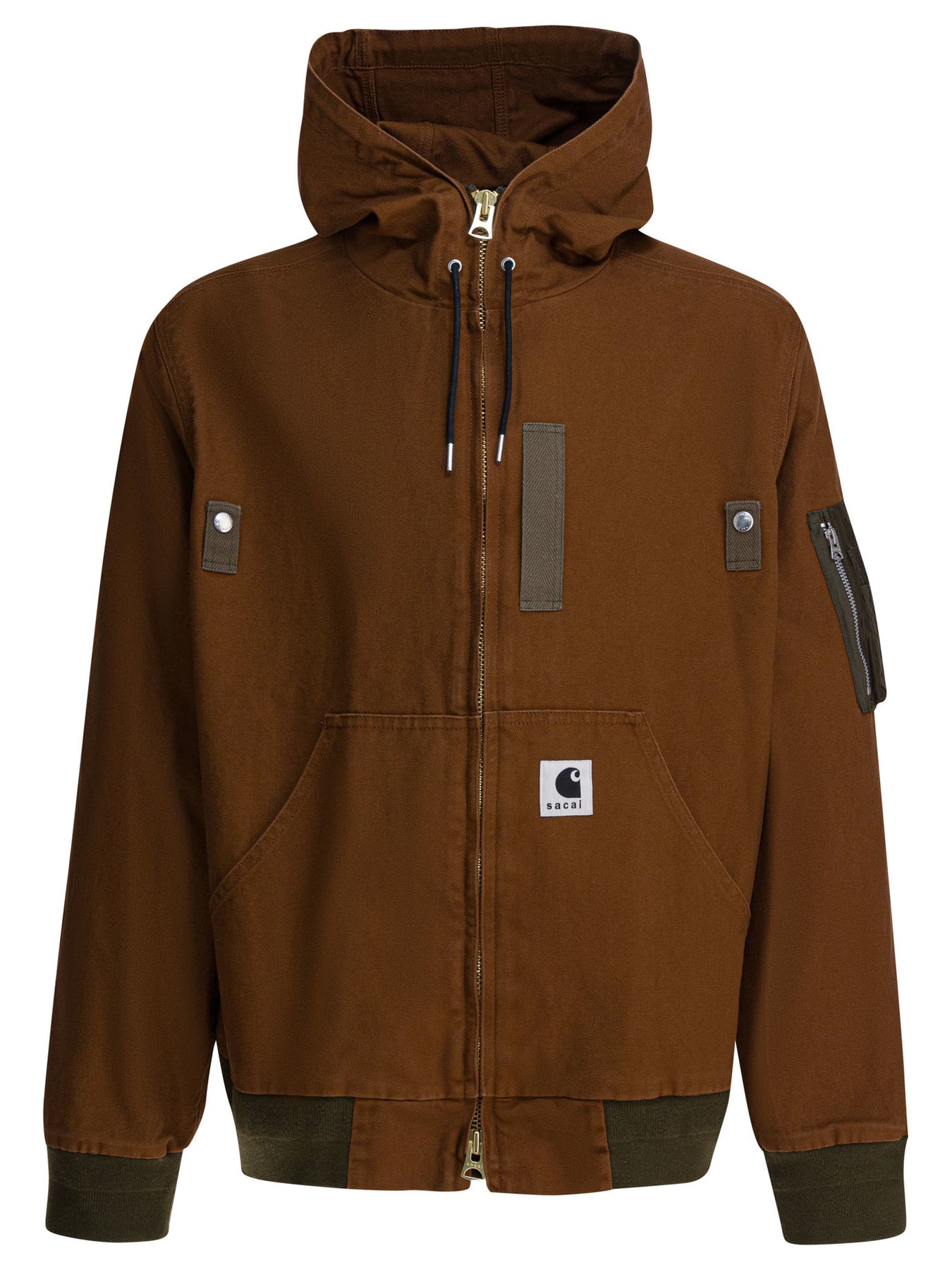"Sacai x Carhartt WIP" Sacai down jacket constructed of pure cotton and fitted with padding. The model features a straight silhouette construction, drawstring-adjustable hood and double-slider front zipper closure. The cuffs and hem are ribbed for a compact effect. Patch pocket on the sleeve and front slant pockets complete the functional configuration of the garment. || - Sacai x Carhartt WIP logo applied - Two-way zipper front closure - Adjustable drawstring hood - Ribbed cuffs and hem - Sleeve pocket - Slanted front pockets - Inner padding - Relaxed fit