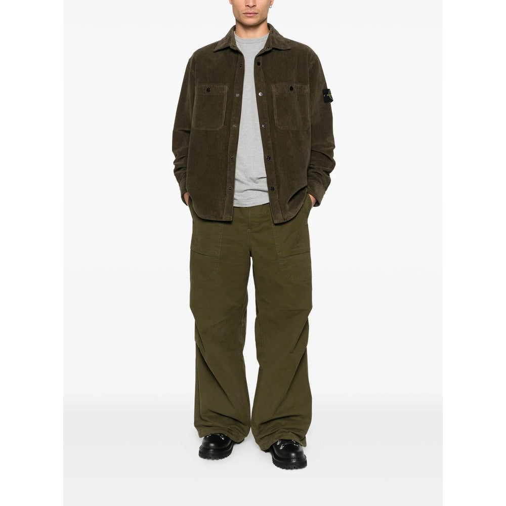 dark brown corduroy texture point collar button fastening chest patch pockets logo patch at the sleeve