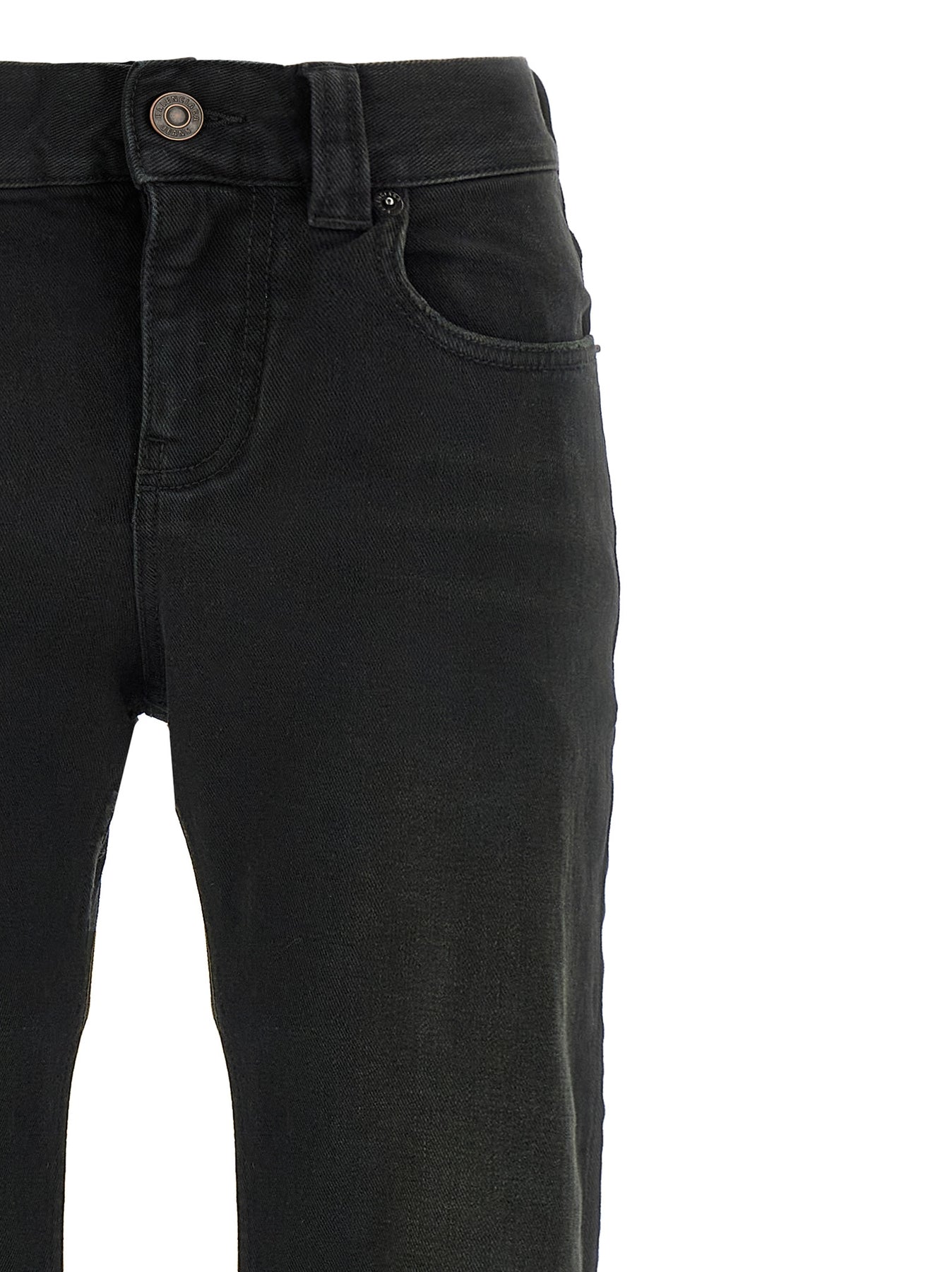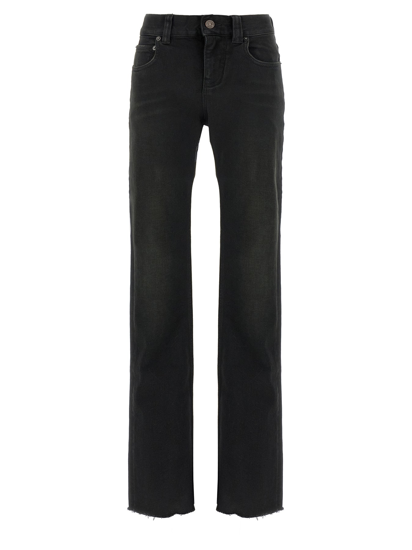 Slightly stretch cotton denim jeans, bootcut model, mid waist, zip and button closure, pockets.