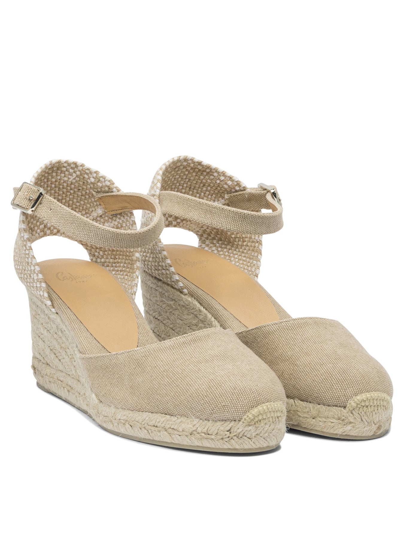 Castañer "Carol 70mm" high espadrilles with washed organic cotton upper, reinforced structure and essential silhouette. Adjustable ankle strap closure and padded insole. Platform is molded from woven natural jute and combines lightness and strength through glued and stitched workmanship. Linear profile, banded construction with raw cut edge, stable base and high grip sole. || - Washed organic cotton upper - Strap closure - Padded insole - Wedge made of woven jute - Rubber sole