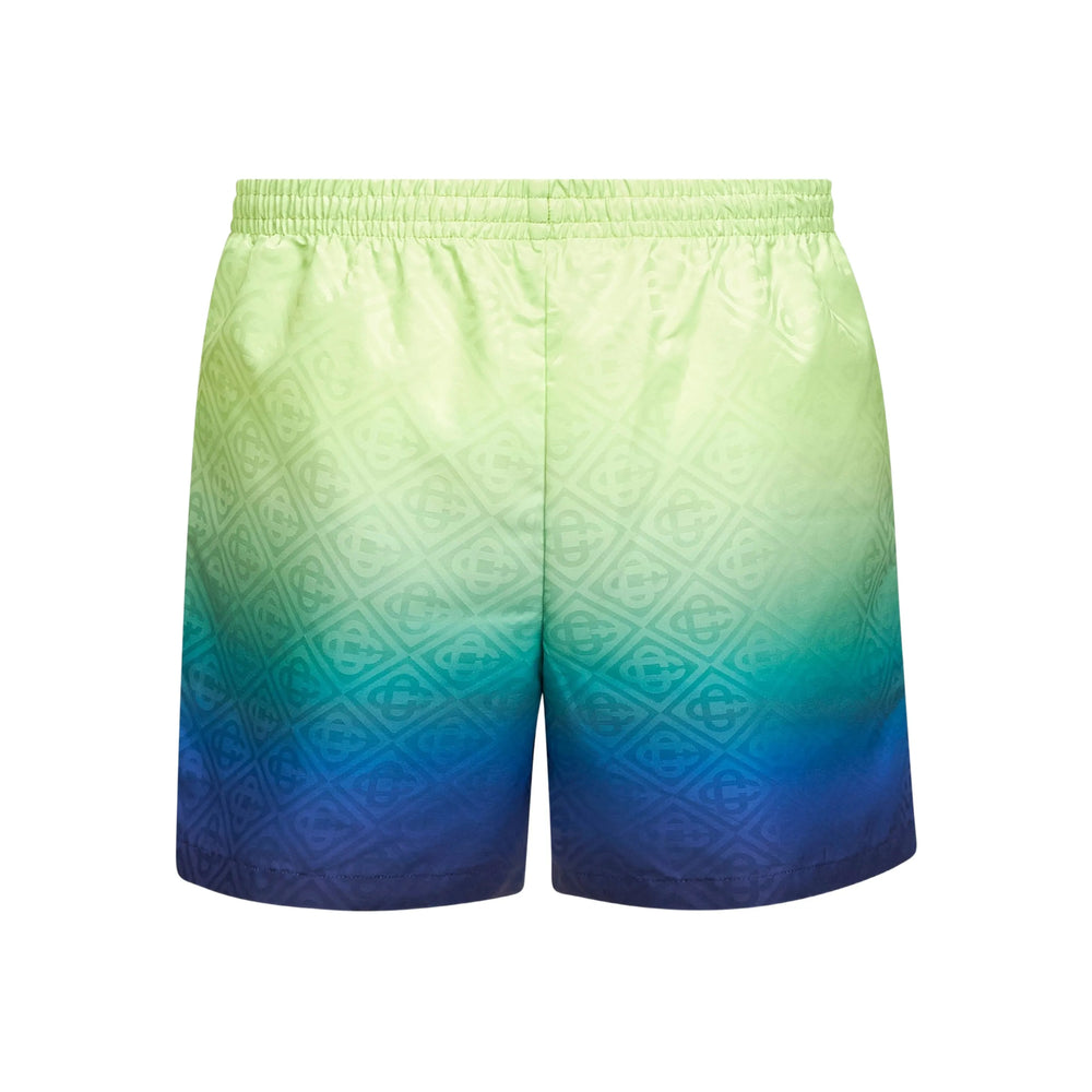 green and blue monogram pattern gradient effect elasticated waistband logo embroidery side inset pockets Be mindful to try on swimwear over your own garments.