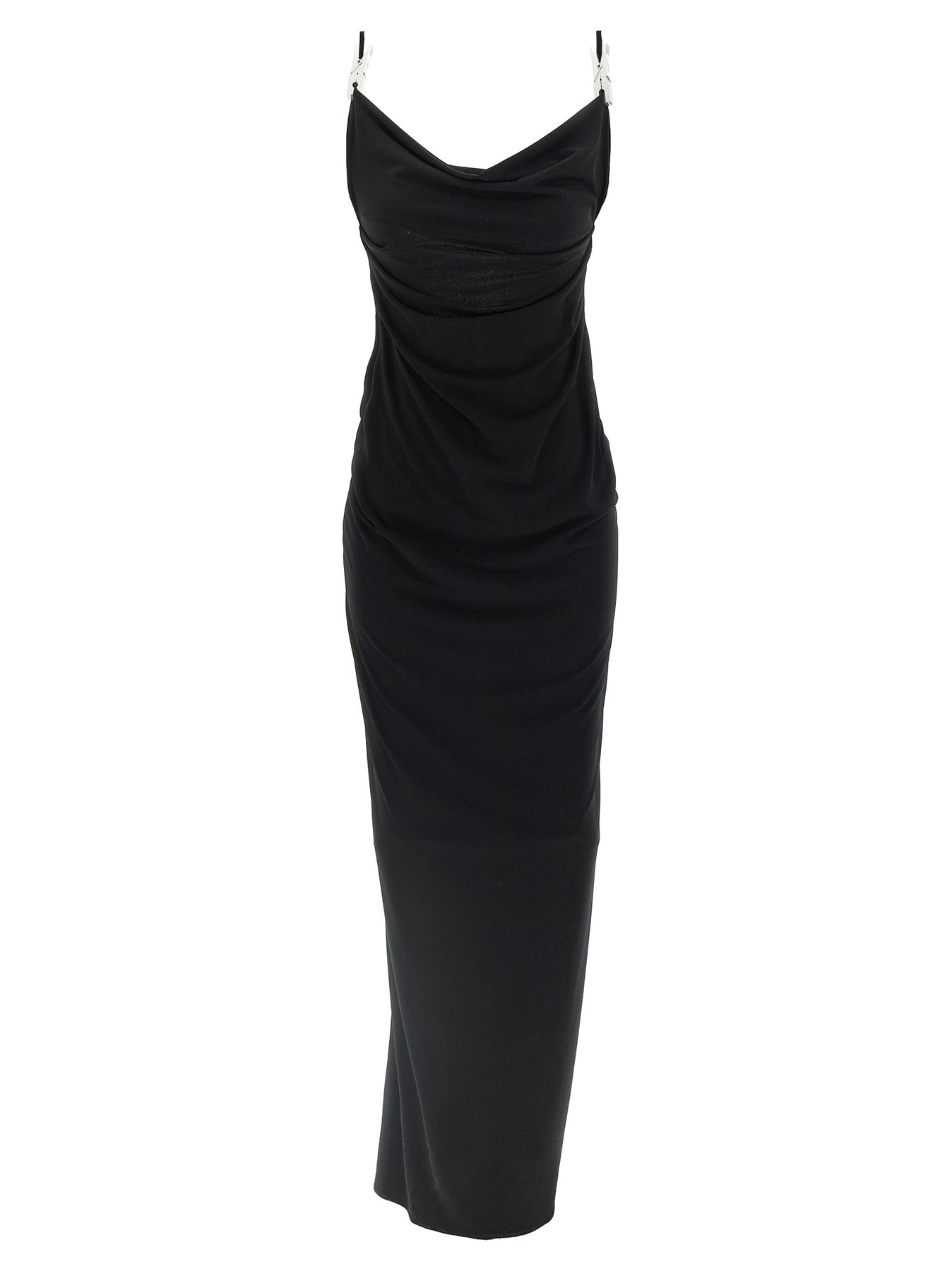 Washing Clip Gala' long dress in light jersey, draped neckline, sleeveless with thin straps, silver metal clothespin details at the front and back, wide asymmetrical neckline at the back, and slightly flared skirt.